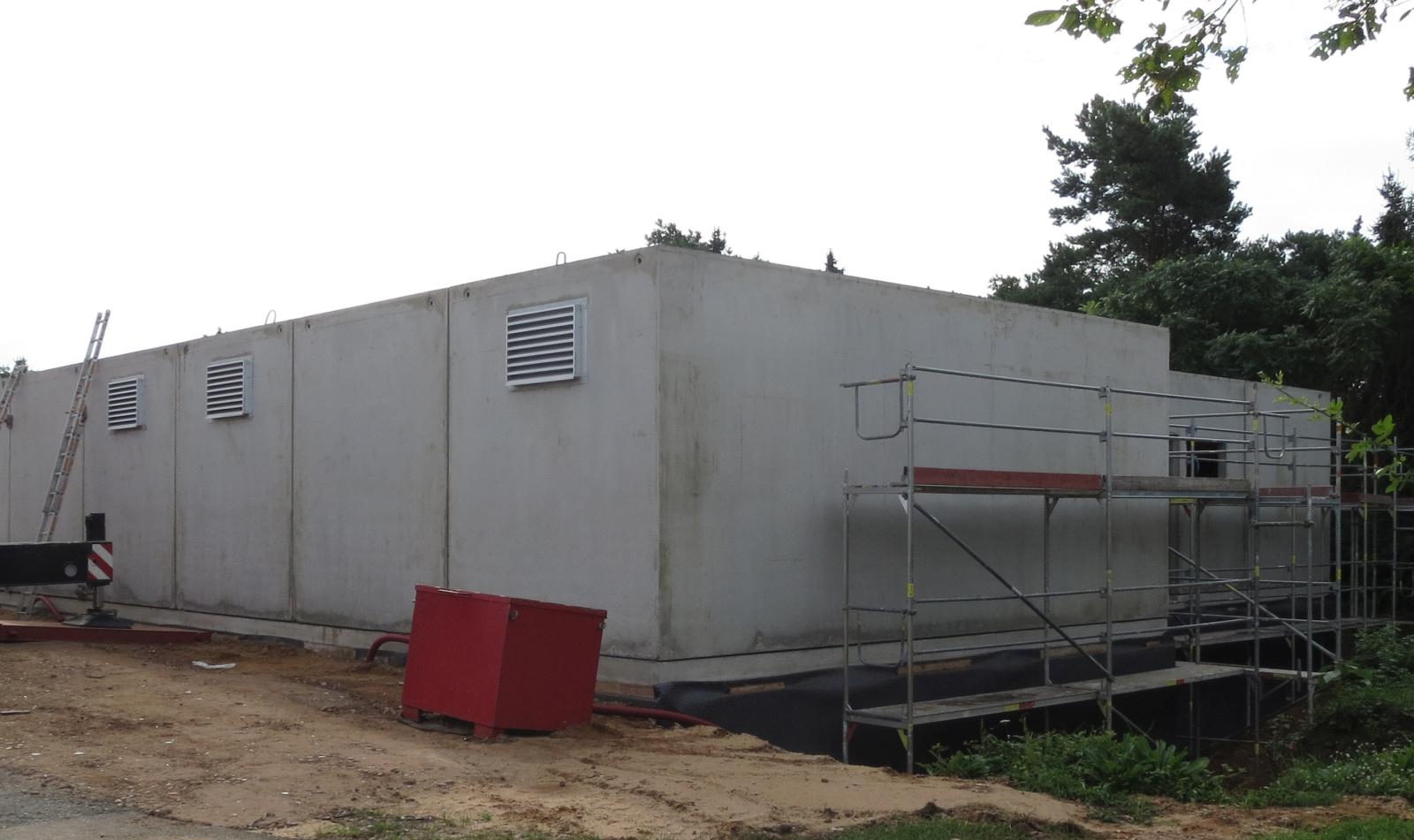 Für die Stadtwerke Mühlheim wurde der Neubau eines 20 kV Schalthauses in der Anton-Dey-Straße geplant. Das voll unterkellerte Gebäude mit einem T-förmigen Grundriss hat Abmessungen von ca. 18,80 x 17,90 m. Das Kellergeschoss wurde in Ortbeton als Weiße Wanne hergestellt. Die Kellerdecke wurde als Elementdecke ausgeführt. Das Erdgeschoss besteht aus insgesamt 14 Raumzellen, die als Stahlbetonfertigteile auf die Baustelle geliefert wurden. Als Dachkonstruktion wurde eine Walmdachkonstruktion aus Holz auf die Raumzellen gesetzt.